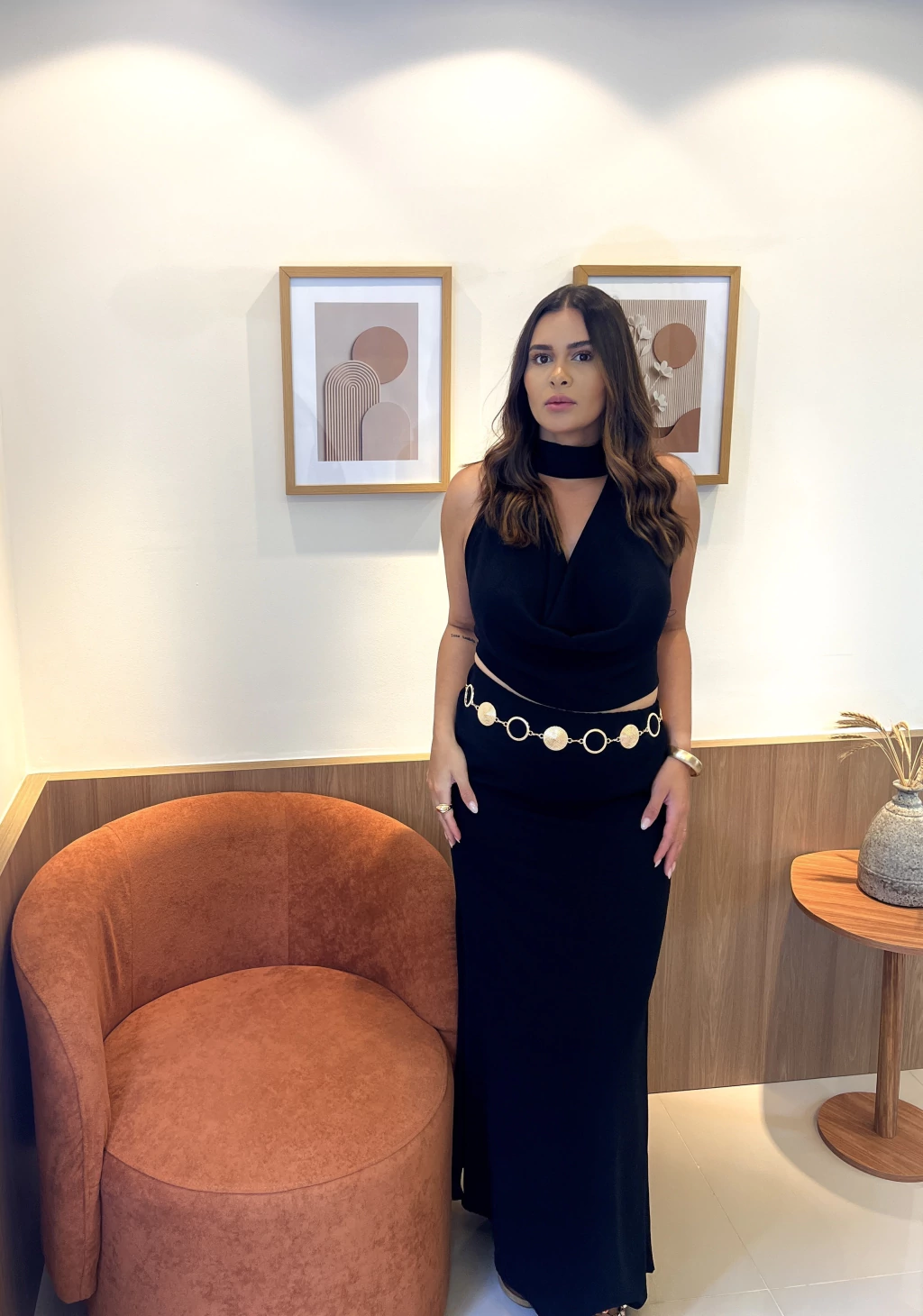 Conjunto Rihana desenvolvido em tecido Duna Air Flow, conhecido por sua leveza e movimento natural. O top possui modelagem frente única, com decote drapeado e recorte frontal que realça a região do colo de forma elegante. A saia longa vem com forro interno, cós com elástico para maior conforto e um acabamento minimalista na barra.